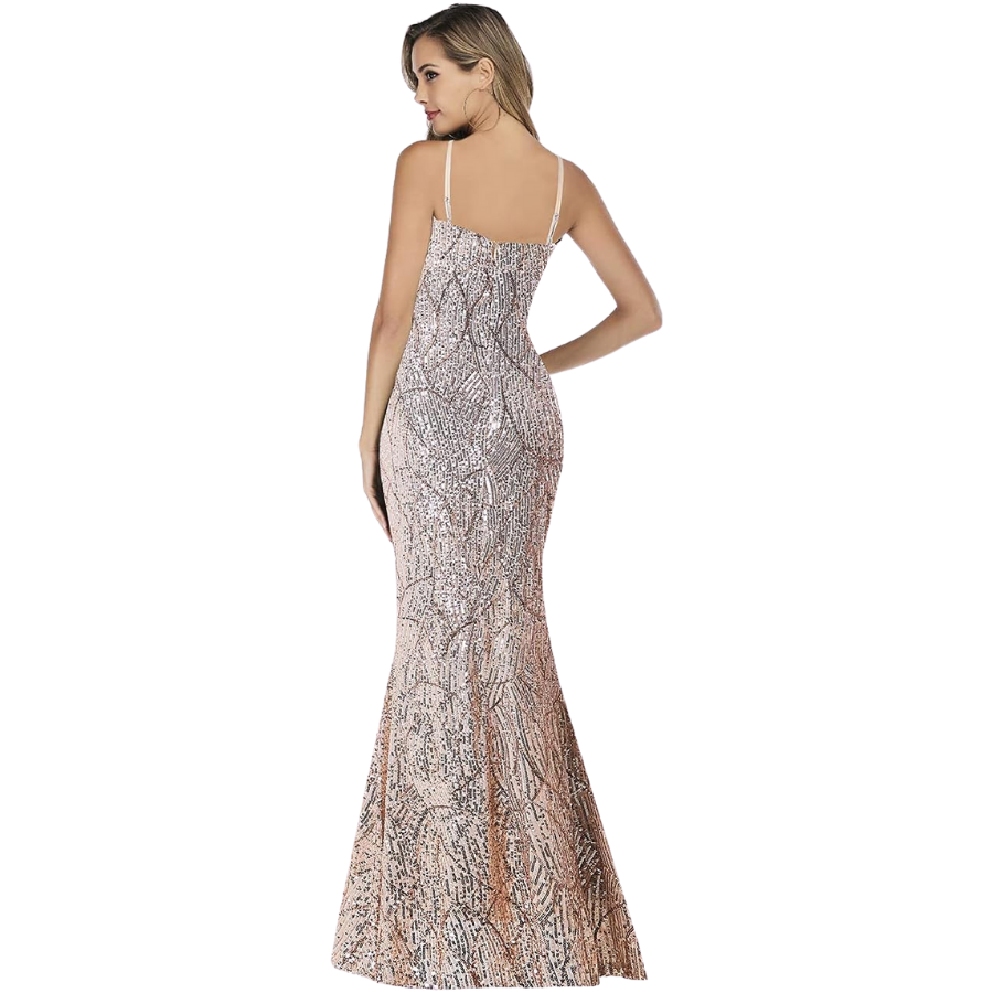 Make a bold statement in this shimmering sequin party gown featuring a deep V-neckline, delicate spaghetti straps, and a sexy high slit. Perfect for formal evenings, weddings, or glamorous parties.