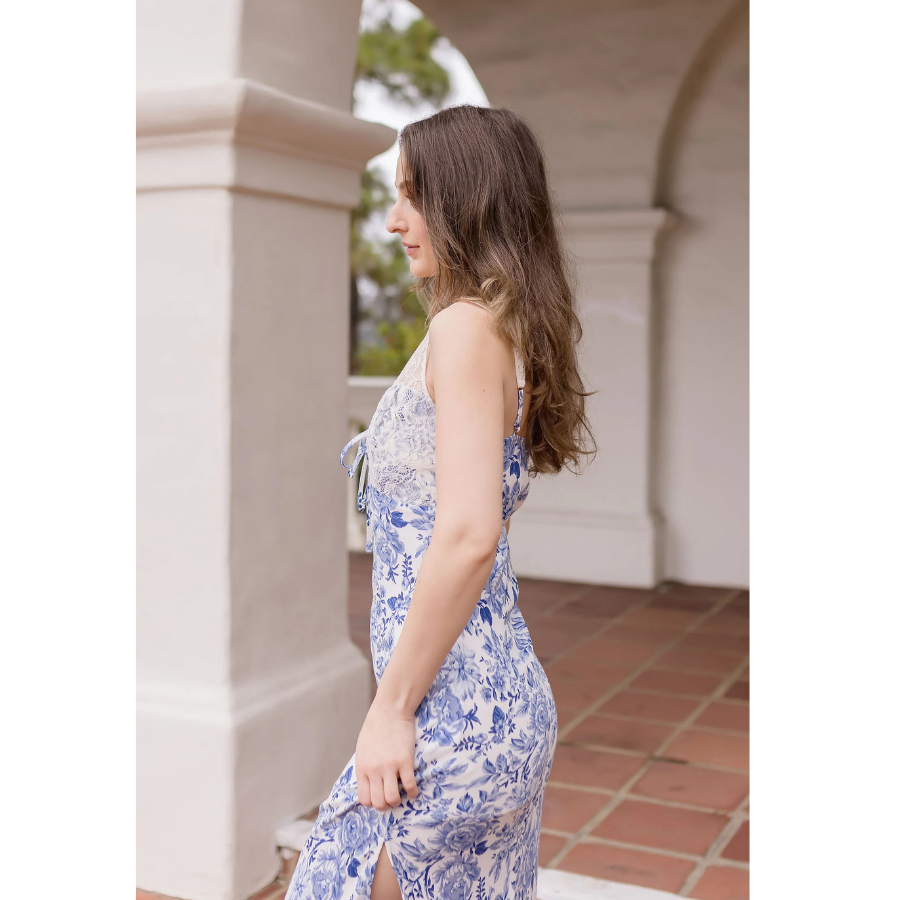 A beautiful sleeveless dress designed for wedding guests, featuring delicate lace contrast and a soft floral print in serene blue tones. Stylish, feminine, and perfect for spring or summer celebrations.