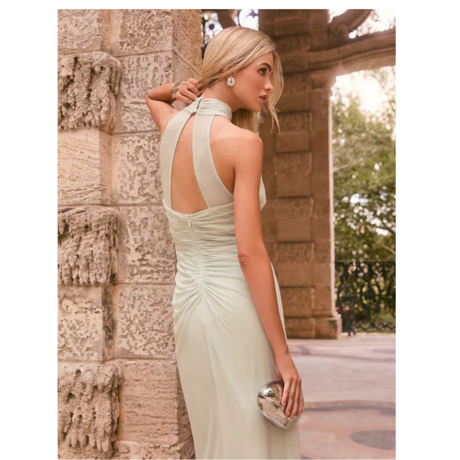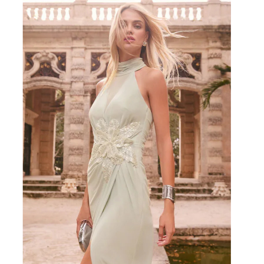 This elegant sage green wedding guest dress features a halter neckline, sheer mesh insert, and delicate floral embellishments. A perfect blend of grace and glamour for outdoor or garden weddings.