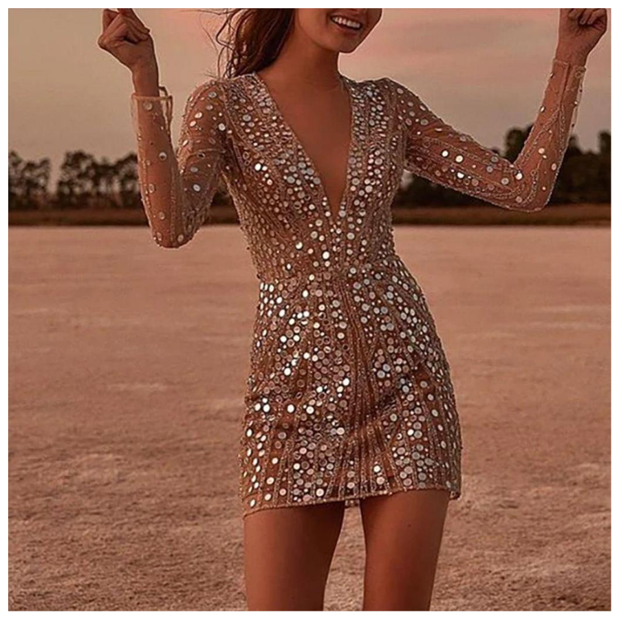 This dazzling gold mini dress features shimmering sequins, a deep V neckline, and long sleeves for a bold and glamorous party look. Perfect for spring celebrations, club nights, and festive evenings.