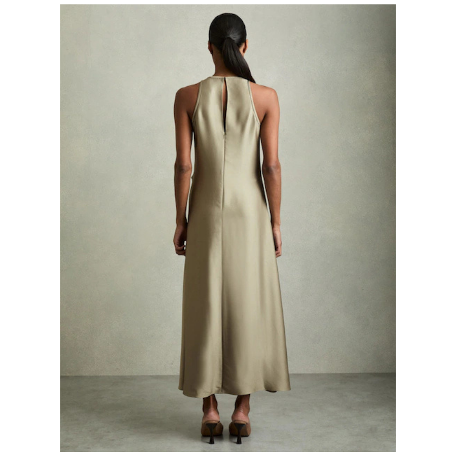 A sophisticated satin formal dress by Reiss in a rich khaki tone, featuring elegant draping and a flattering tuck detail. Perfect for cocktail events, formal dinners, or chic evening occasions.