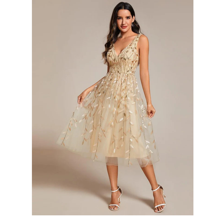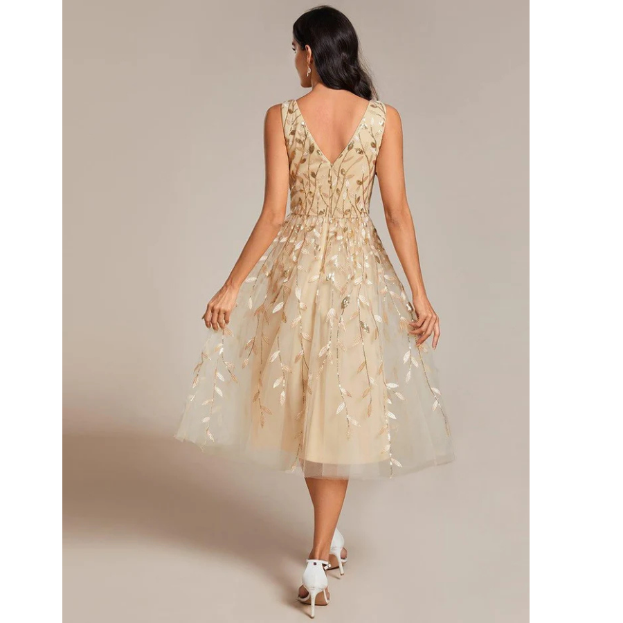Shimmer with sophistication in this sleeveless A-line midi dress, featuring a flattering V-neckline and elegant sequin detailing. A perfect choice for wedding guests who want to stand out—gracefully.