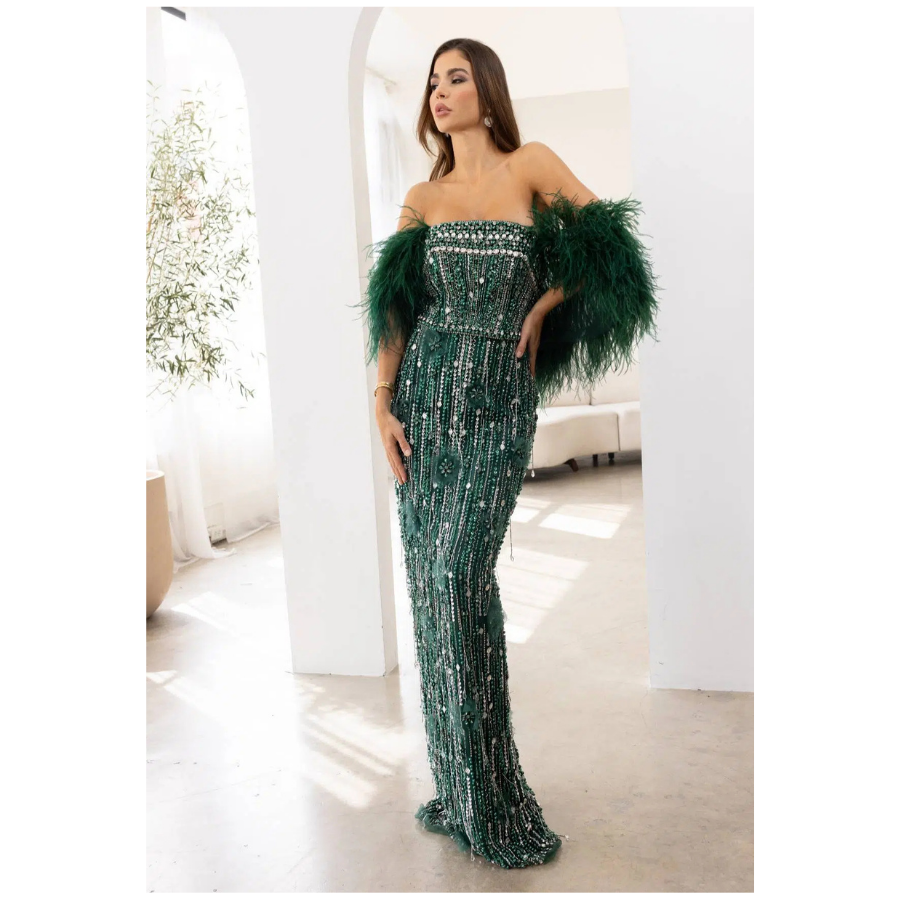 A sophisticated hunter green evening gown featuring a flattering V-line neckline and off-shoulder design in soft tulle. The sleek column silhouette creates an elegant and timeless look for formal events.