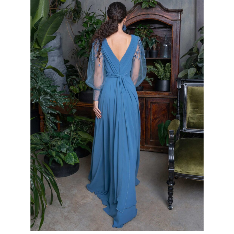 This elegant chiffon evening dress features a deep V-neckline, long puffy sleeves, and a stylish front slit. Lightweight and flowy—perfect for formal occasions, weddings, or evening parties.