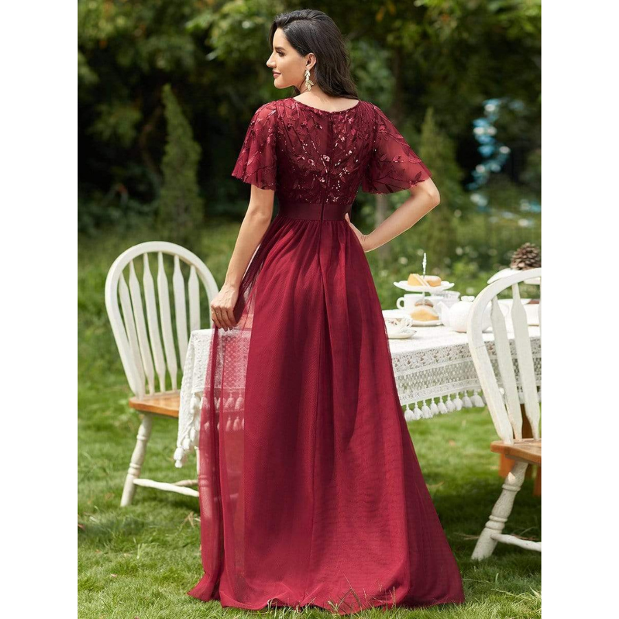 Graceful and timeless, this floor-length A-line dress features delicate embroidery and soft short sleeves. Ideal for formal parties, receptions, or any elegant evening celebration.