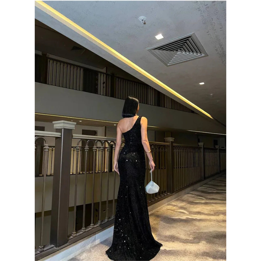 Timeless elegance meets modern glamour in this stunning WoolnClyde black velvet evening gown. Designed with a luxurious one-shoulder neckline, this maxi dress is crafted from soft velvet fabric and adorned with delicate sequin detailing that sparkles with every step.