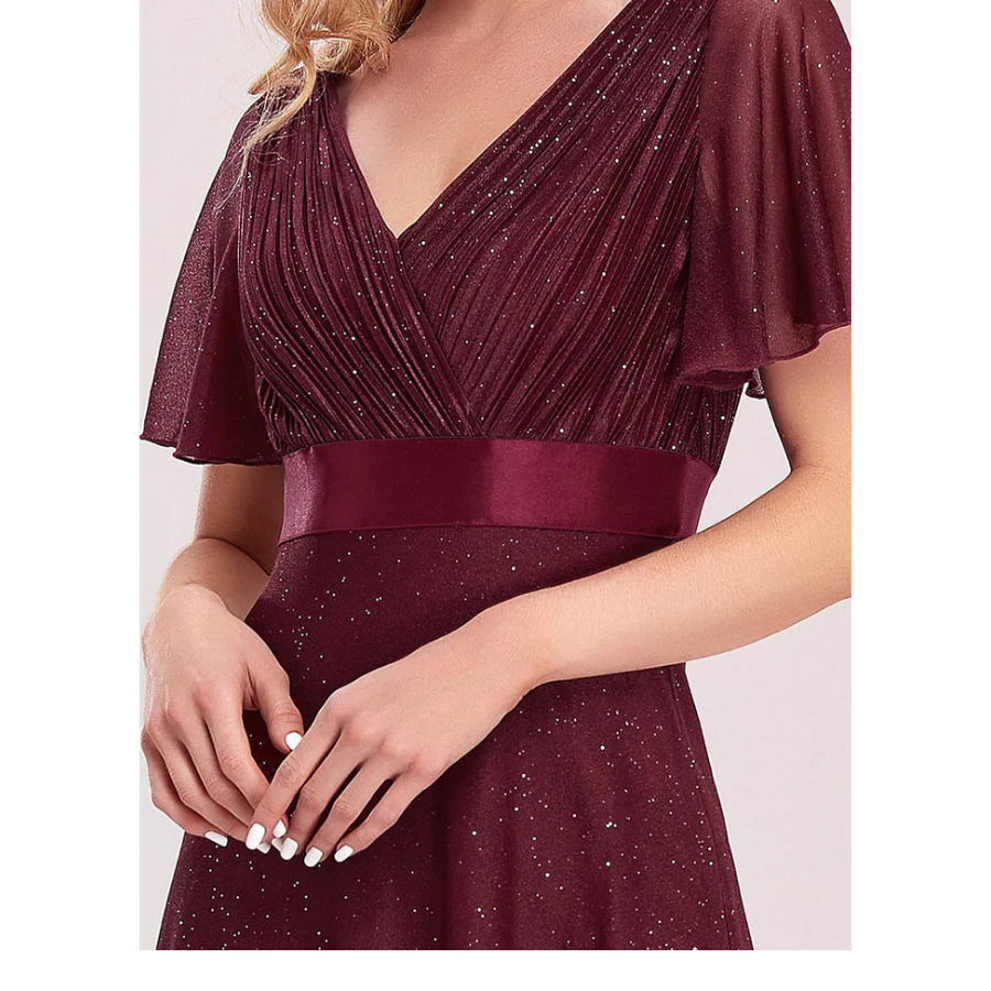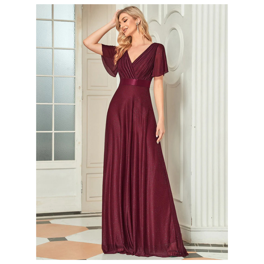 An elegant A-line evening dress featuring a plunging deep V neckline and soft ruffle sleeves. Ideal for formal events, receptions, or stylish party looks