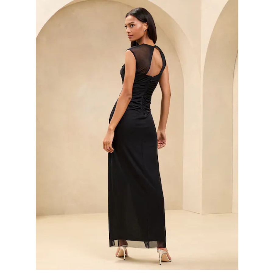 An eye-catching black formal dress by Lipsy, featuring dazzling diamante floral trim, mesh panel detailing, and flattering ruched accents. Ideal for cocktail nights, formal parties, and evening glam.