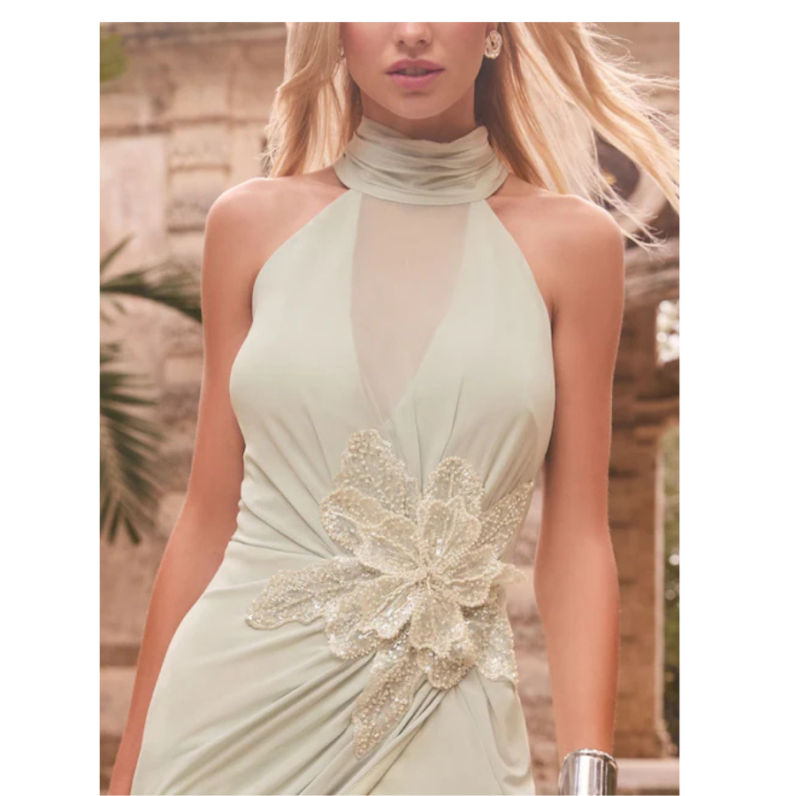 This elegant sage green wedding guest dress features a halter neckline, sheer mesh insert, and delicate floral embellishments. A perfect blend of grace and glamour for outdoor or garden weddings.