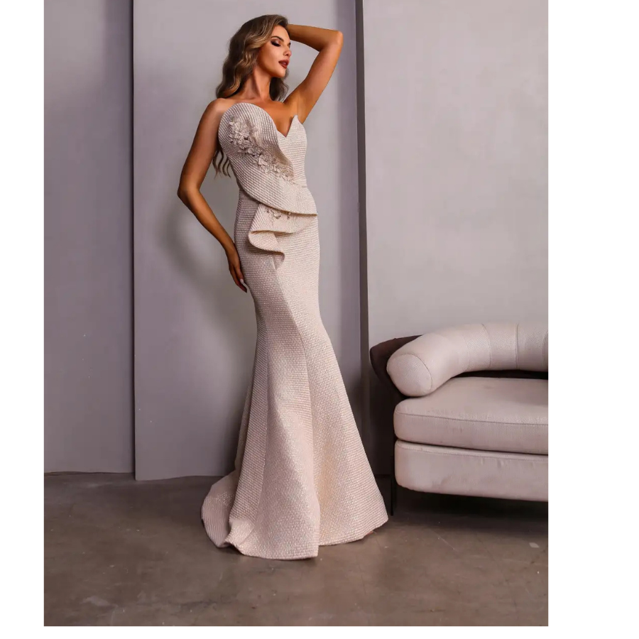 Make a bold impression in this sleeveless evening gown with a metallic jacquard finish and a trumpet silhouette. Perfect for formal functions, galas, and grand celebrations.