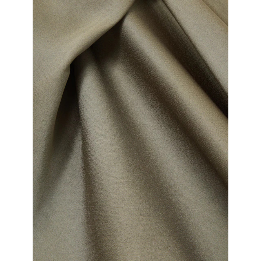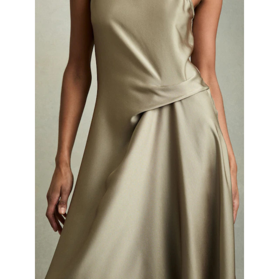 A sophisticated satin formal dress by Reiss in a rich khaki tone, featuring elegant draping and a flattering tuck detail. Perfect for cocktail events, formal dinners, or chic evening occasions.