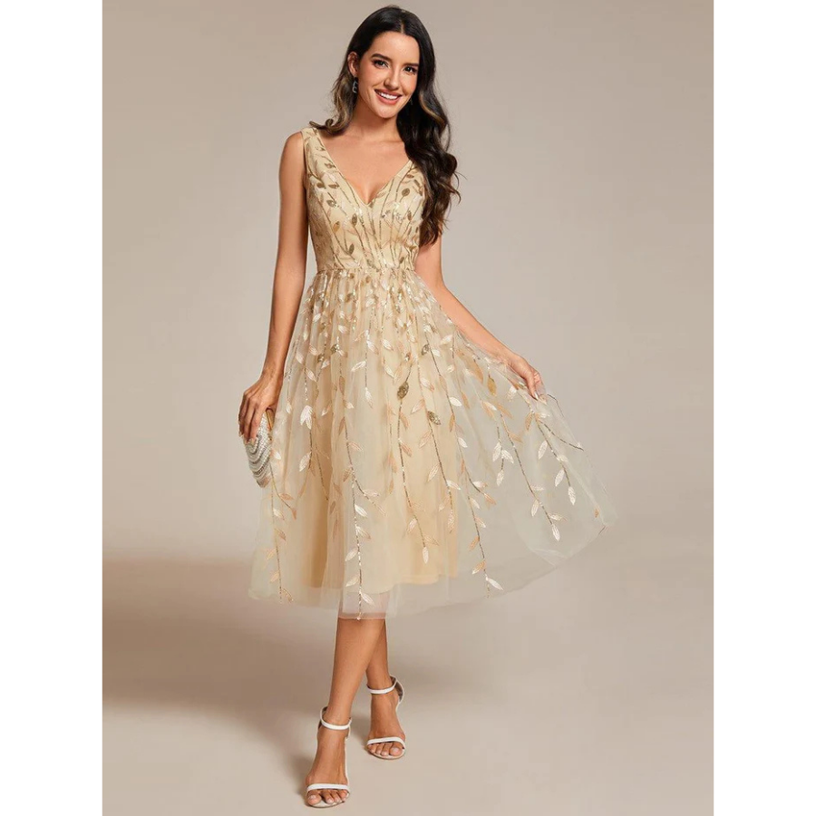 Shimmer with sophistication in this sleeveless A-line midi dress, featuring a flattering V-neckline and elegant sequin detailing. A perfect choice for wedding guests who want to stand out—gracefully.