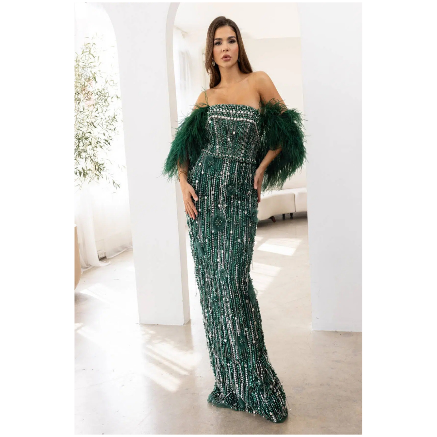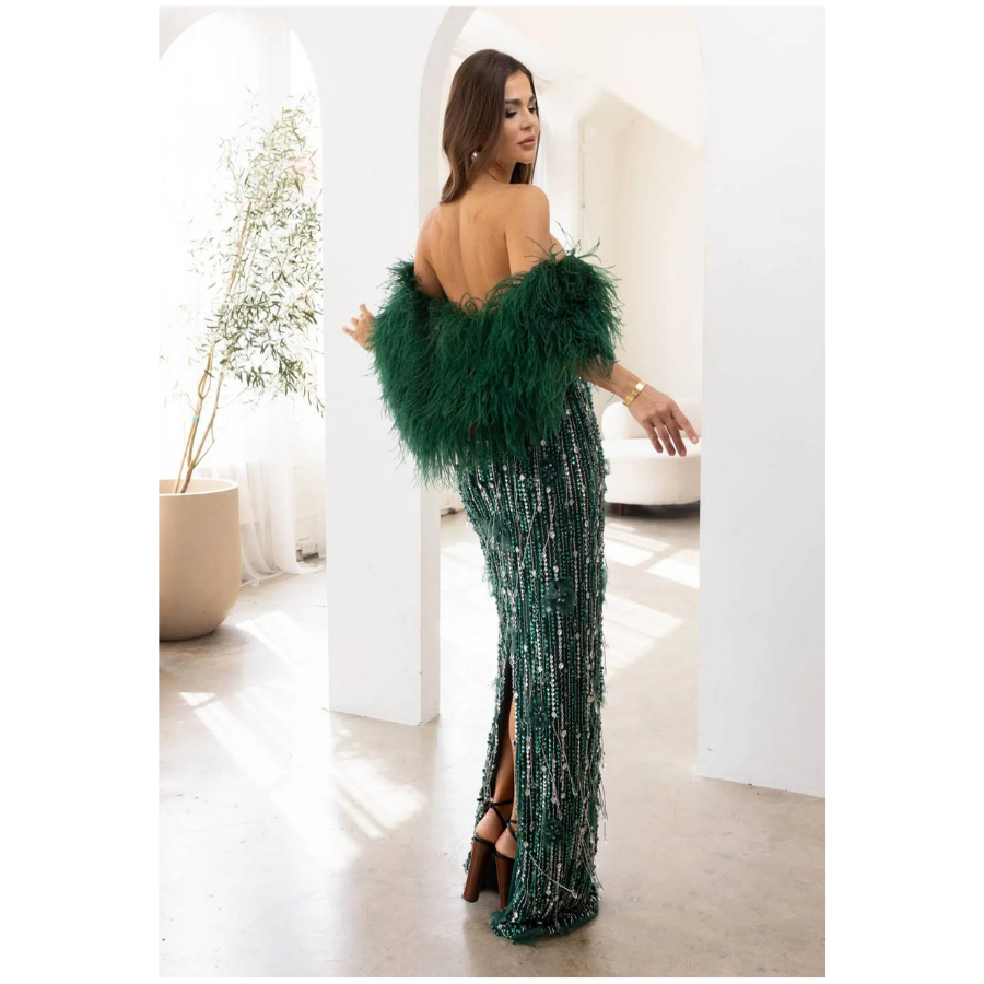 A sophisticated hunter green evening gown featuring a flattering V-line neckline and off-shoulder design in soft tulle. The sleek column silhouette creates an elegant and timeless look for formal events.