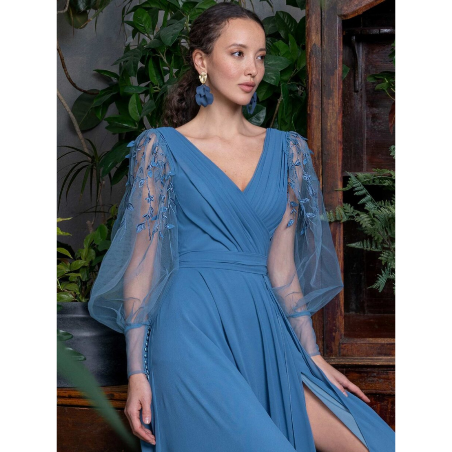 This elegant chiffon evening dress features a deep V-neckline, long puffy sleeves, and a stylish front slit. Lightweight and flowy—perfect for formal occasions, weddings, or evening parties.