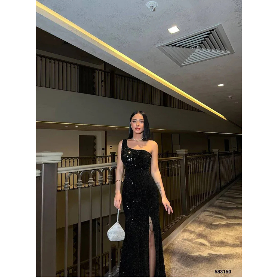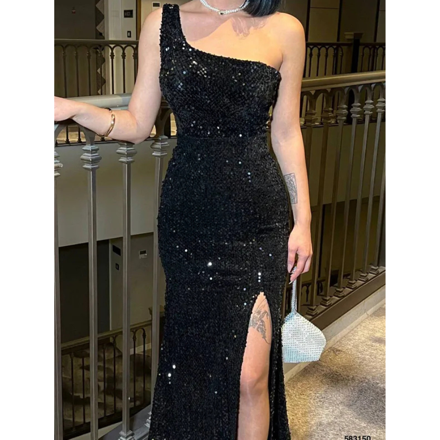 Timeless elegance meets modern glamour in this stunning WoolnClyde black velvet evening gown. Designed with a luxurious one-shoulder neckline, this maxi dress is crafted from soft velvet fabric and adorned with delicate sequin detailing that sparkles with every step.